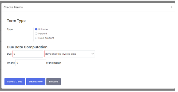 - Klik create Sistem akan menampilkan form untuk membuat payment terms baru. Form ini terdiri dari beberapa fields, yaitu : payment terms, description on invoice, dan terms.