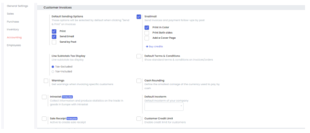 Menu ini berfungsi untuk mengaktifkan dan menonaktifkan fitur yang ada di dalam modul accounting. Menu ini berada di configuration > settings. Perubahan yang terjadi pada menu settings akan menyebabkan perubahan proses bisnis dan fungsionalitas pada modul accounting. Secara default, fitur - fitur yang diatur berkaitan dengan rounding method dan default sending option. Berikut detailnya :