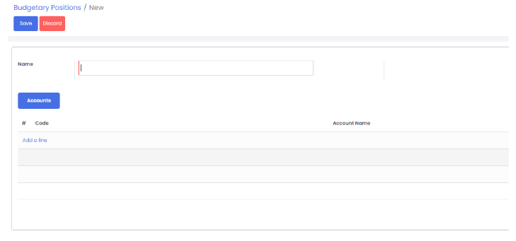 - Klik create, form budgetary position terdiri dari beberapa field yaitu : nama dan nama akun - akun. Berikut gambar form budgetary positions :