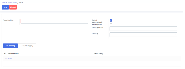 Fitur ini berfungsi untuk pengaplikasian pajak terhadap produk - produk tertentu. Selain itu juga pengaplikasian nominal pajak terhadap negara tertentu. Karena pada umumnya nilai pajak yang diaplikasikan setiap negara berbeda bergantung terhadap regulasi disana. Berikut langkah - langkah untuk membuat posisi fiskal :