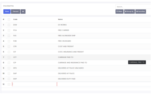 Incoterms adalah kepanjangan dari international commercial terms. Tujuan adanya incoterms adalah meminimalisir kesalahpahaman antara eksportir dan importir. Menu ini berfungsi sebagai master data atas incoterms. Dengan begini user mampu membuat incoterms sesuai dengan kebutuhan. Menu ini berada di configuration > incoterms. Berikut langkah - langkah untuk mendefinisikan incoterm baru :