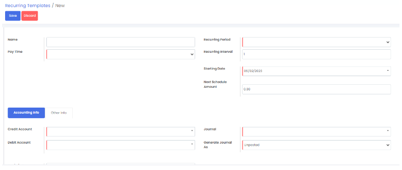 Fitur ini berfungsi untuk melakukan generate ayat jurnal yang sifatnya berkala. Tujuan dibuatnya fitur ini adalah untuk mengurangi kegiatan yang bersifat manual. Berikut langkah - langkah untuk membuat recurring templates :
