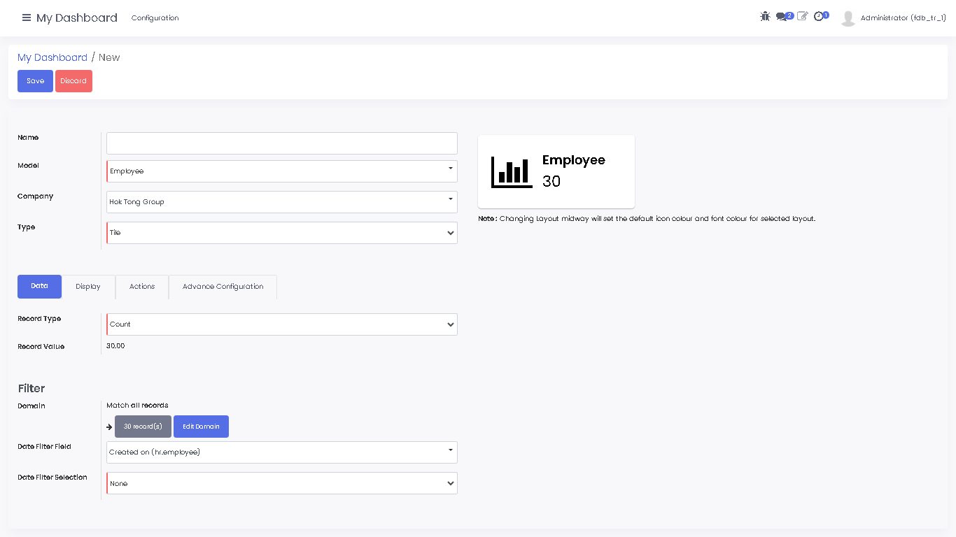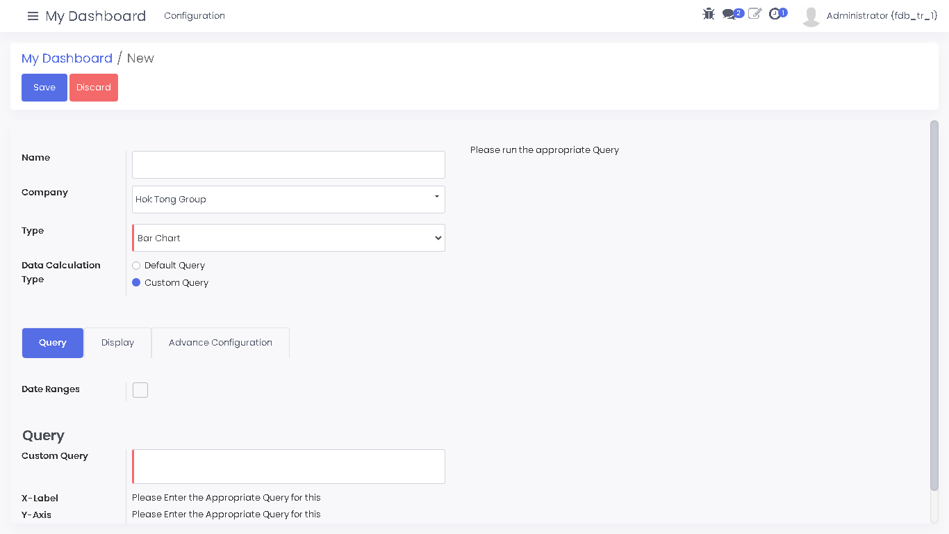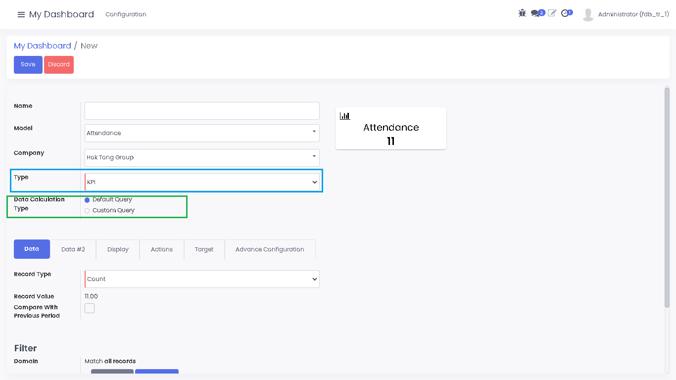 Tipe KPI hampir sama dengan tile chart, namun di tipe KPI user diberikan pilihan bisa menggunakan data calculation type yaitu Default Query dan Custom Query.