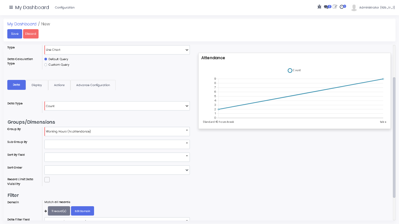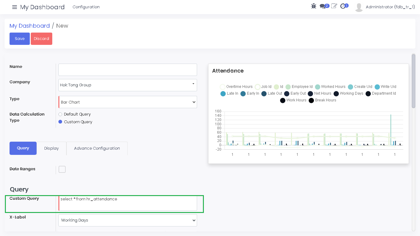 Jenis Line Chart, konfigurasinya tidak jauh berbeda dengan Bar Chart. User juga diminta untuk memilih Default Query atau memilih Custom Query untuk mendapatkan data yang akan disajikan pada chart.