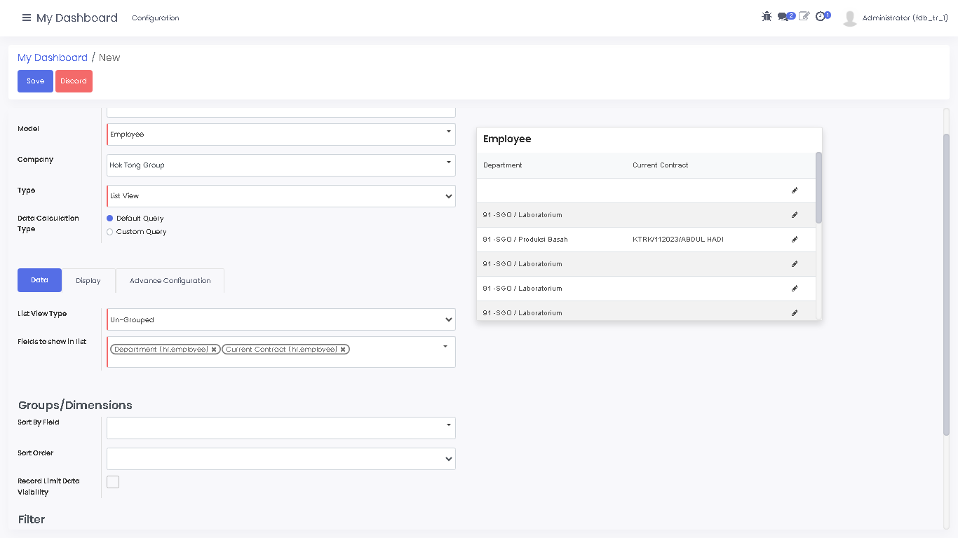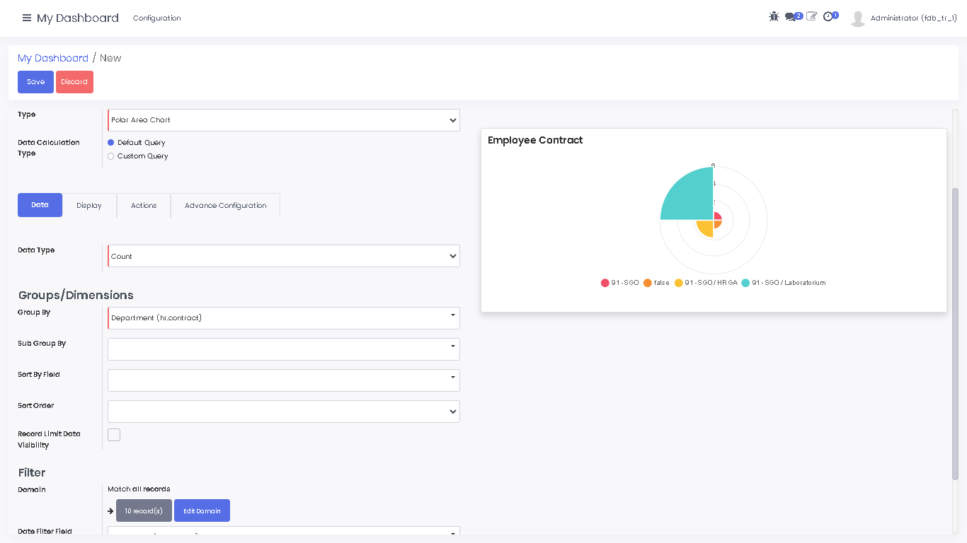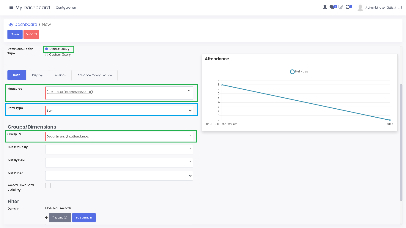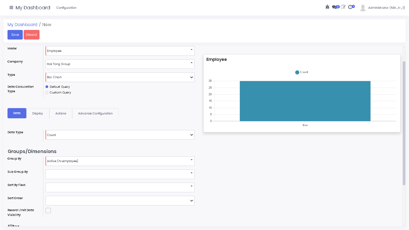 Pada tipe Bar Chart perlu mengisi informasi ’Data Calculation Type’' dan User juga diminta untuk memilih Default Query atau memilih Custom Query untuk mendapatkan data yang akan disajikan pada chart. + #### 1. Default Query Setelah mengisi informasi model, user perlu mengisi informasi Data Type. Ketika memilih Data Type Sum dan Average, akan tampil informasi Measures dan Line Measures yang nantinya akan digunakan untuk menampilkan chart. User juga akan diminta untuk mengisi konfigurasi berikut di bawah tab Group/Dimensions: * Group By * Sub Group By * Sort By Field * Sort Order * Record Limit Data Visibility