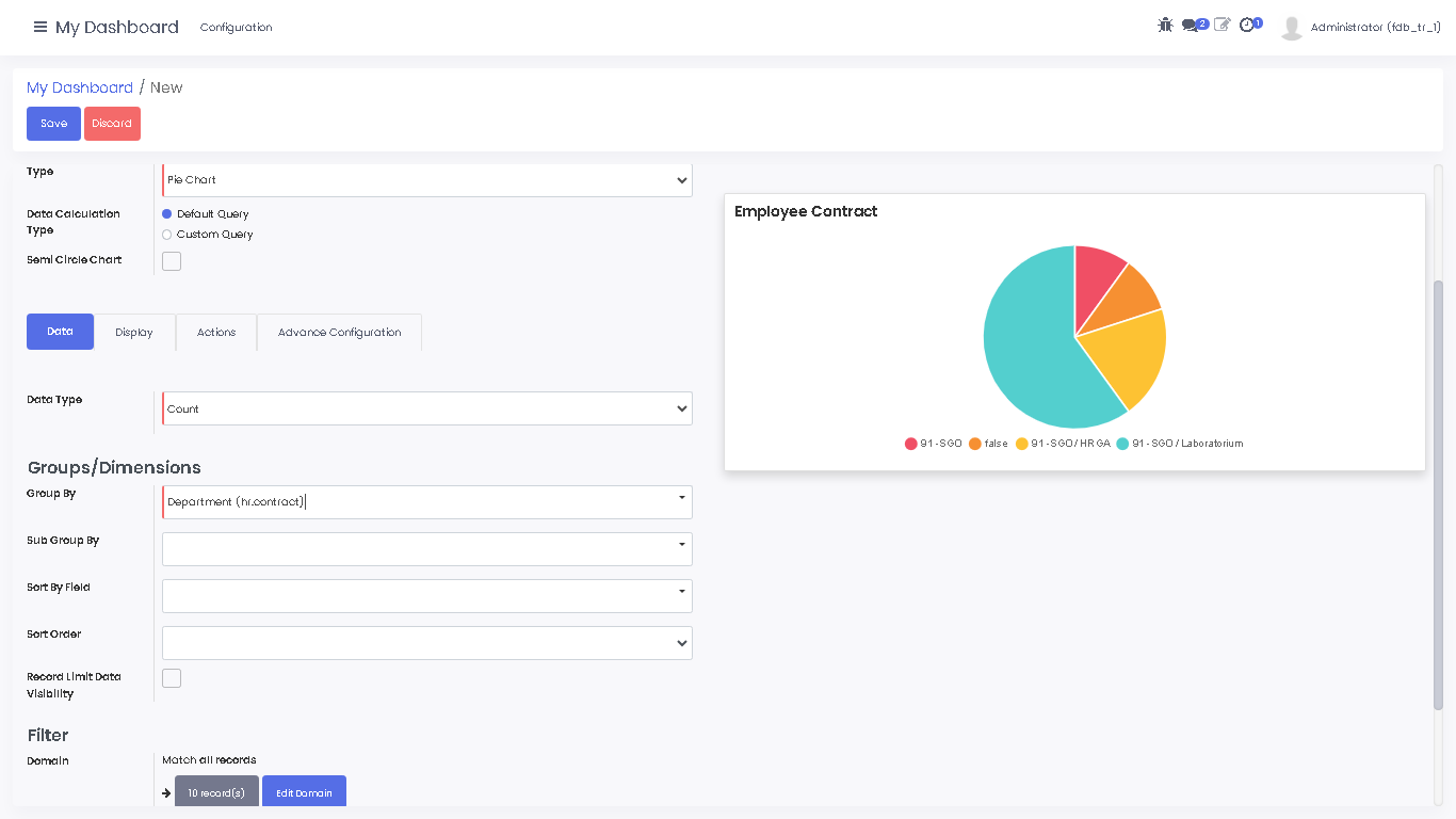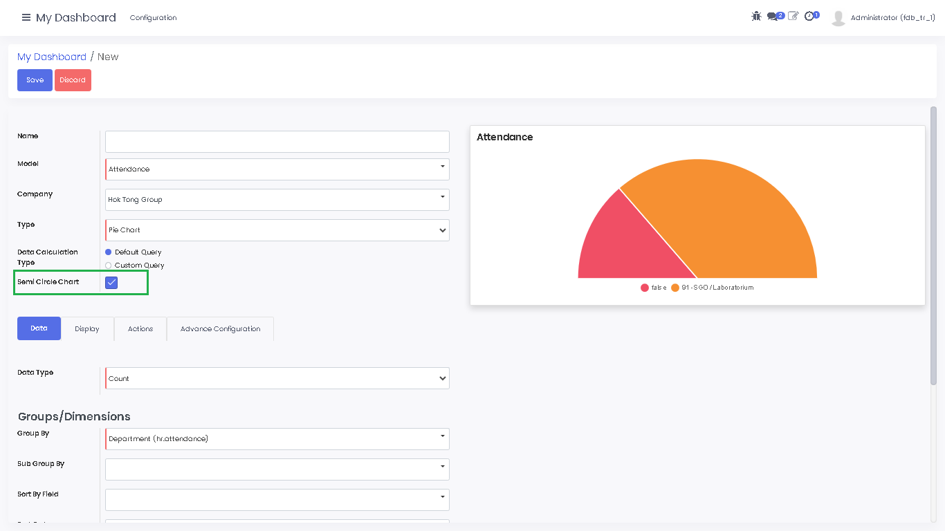 Konfigurasi untuk tipe pie chart sama dengan Area Chart hanya saja chart disajikan dalam bentuk lingkaran dan kelompok/group data disajikan dalam bentuk potongan dari lingkaran menyerupai potongan kue pie. Bila Semi circle chart dichecked maka chart yang ditampilkan dalam bentuk ½ lingkaran