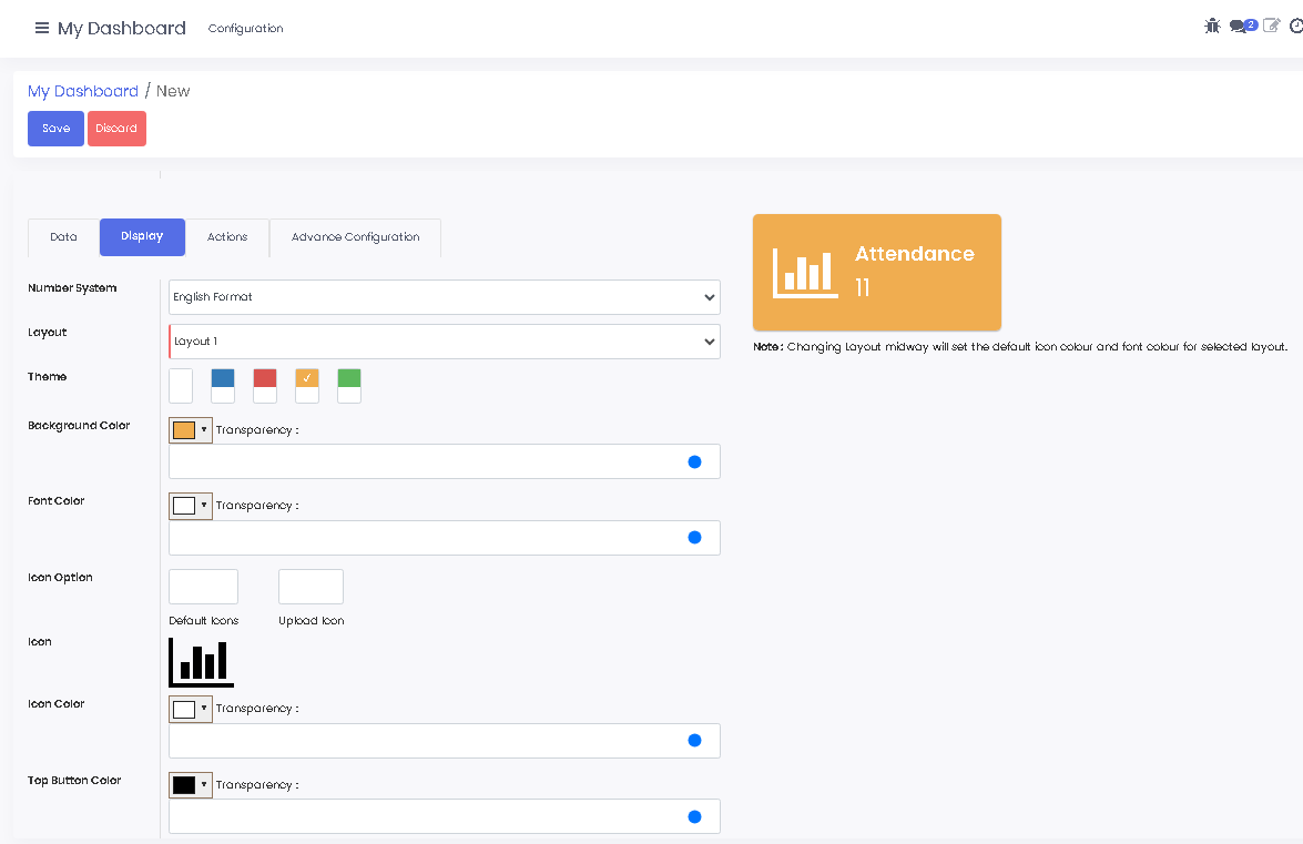 Tab 'Display' digunakan untuk setting dashboard berdasar warna, layout, number system