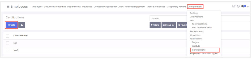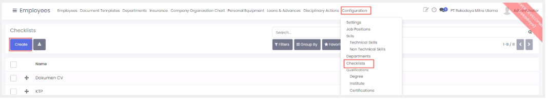 - Pilih menu configuration > employee document type kemudian klik create