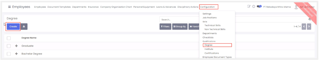 Fitur ini berfungsi untuk membuat data tingkat pendidikan untuk karyawan di perusahaan yang juga akan terintegrasi sebagai opsi ketika memilih data untuk menentukan degree ketika membuat data karyawan.