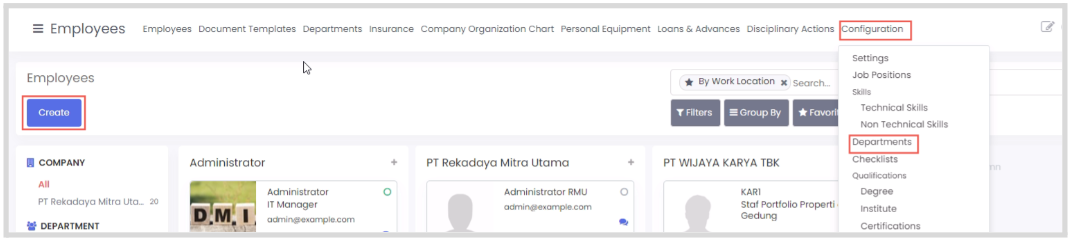 - Pilih menu configuration > departments kemudian klik create.