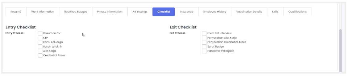 Fitur ini berfungsi untuk membuat master data terkait ceklis yang digunakan untuk kebutuhan HR. Anda juga dapat menentukan tipe ceklis sesuai tahap ceklis yang diisi.