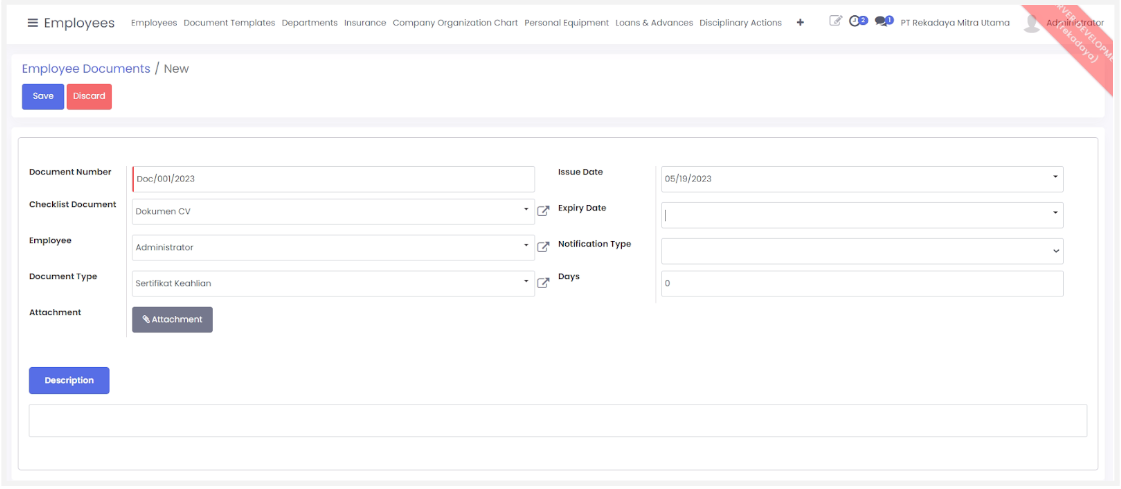 Fitur ini berfungsi untuk membuat master data tipe dokumen yang dimiliki oleh karyawan. Data pada fitur ini dapat terintegrasi dengan menu employee document dimana data dapat dijadikan opsi ketika memilih tipe dokumen.