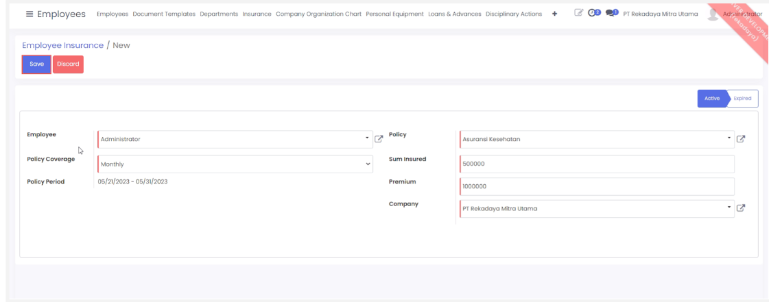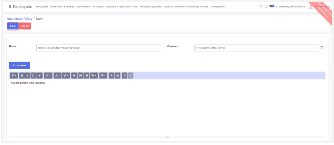 - Policy Coverage: Pilih kriteria asuransi yang diberikan ke karyawan