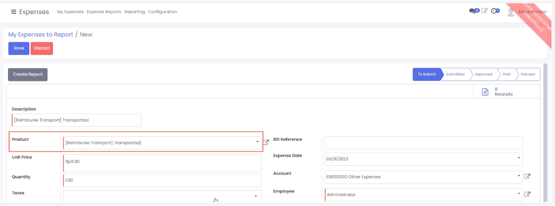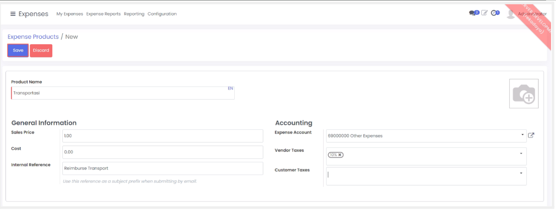 - Pilih menu configuration> Expense Product kemudian klik create.