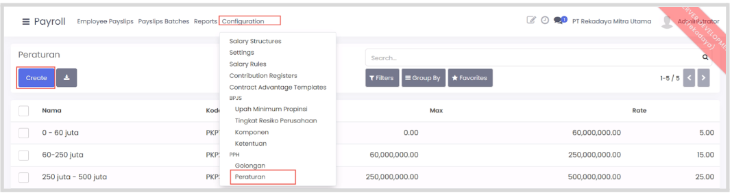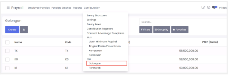 Pilih menu configuration > ketentuan pesangon kemudian klik create.