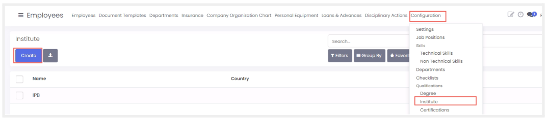 Pilih menu configuration > institute kemudian klik create