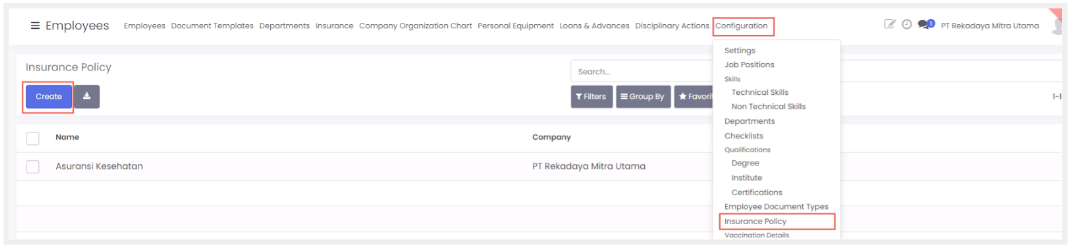 Fitur ini berfungsi untuk membuat master data terkait asuransi yang tersedia di perusahaan untuk karyawan dimana data dapat terintegrasi dengan kolom insurance ketika membuat data karyawan baru.