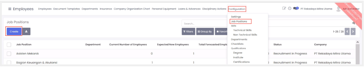 - Pilih menu configuration > job positions kemudian klik create.