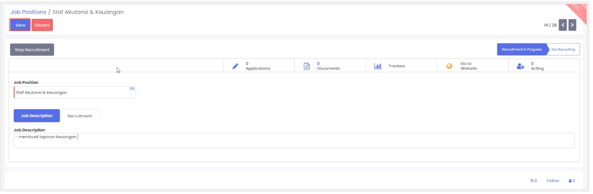Klik save. Catatan: Smart button pada halaman dapat digunakan untuk ke halaman lain yang terintegrasi dengan tahap rekrutmen pegawai.