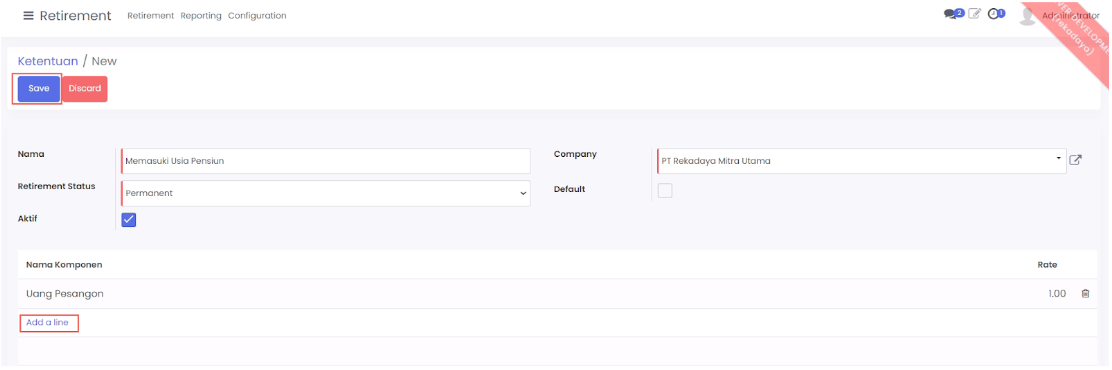 - Aktif: Ceklis untuk mengaktifkan opsi. Ini akan terintegrasi ketika user membuat data pengajuan retirement
