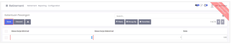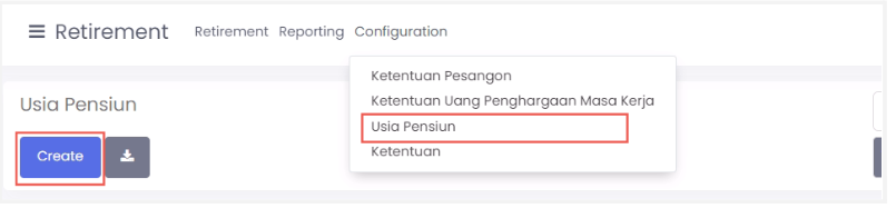 - Pilih menu configuration > usia pensiun kemudian klik create.