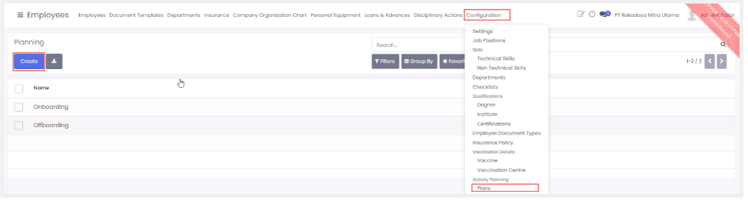 - Pilih menu configuration > planning kemudian klik create.