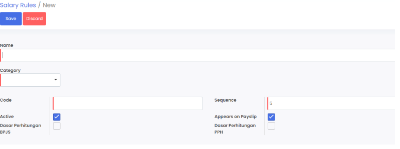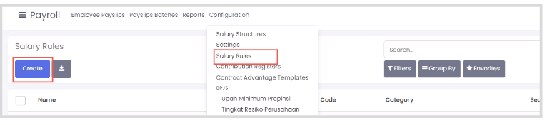 - Pilih menu configuration > salary rules kemudian klik create.