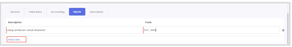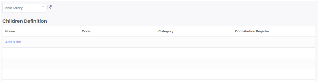 - Tab child rules: pilih sub-komponen pada komponen utama gaji yang sedang dibuat (jika tersedia). Klik add line untuk melakukan konfigurasi sub komponen gaji (sama dengan membuat komponen gaji)