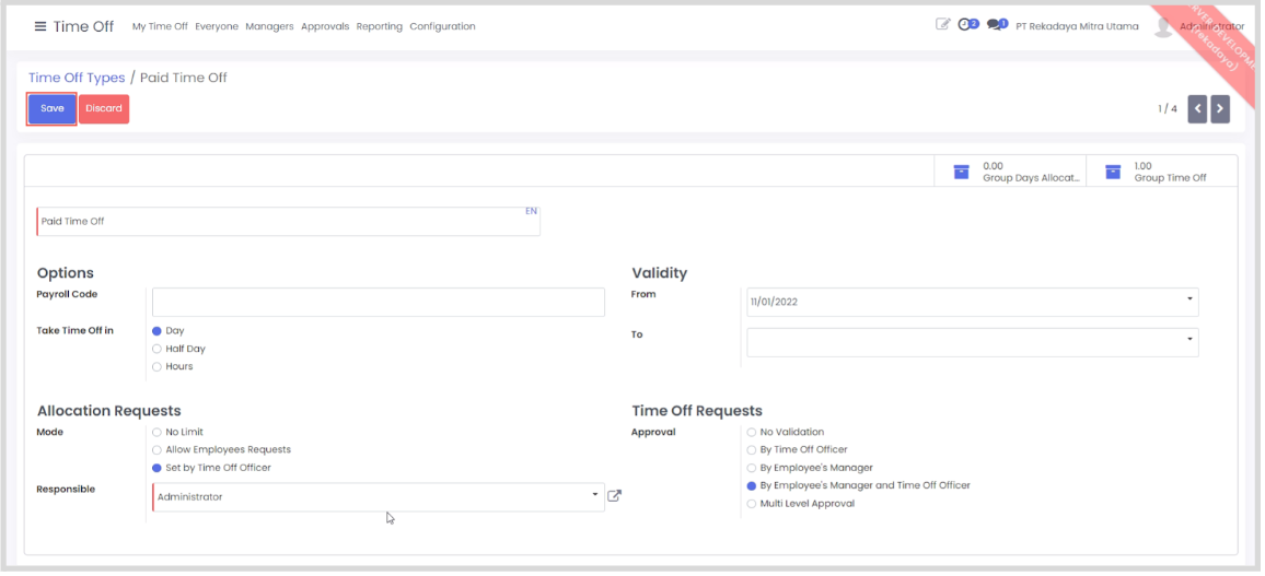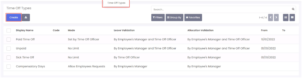 - Pilih menu configuration > time off type kemudian klik create.