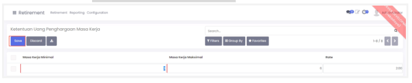 - Pilih menu configuration > ketentuan uang penghargaan masa kerja kemudian klik create