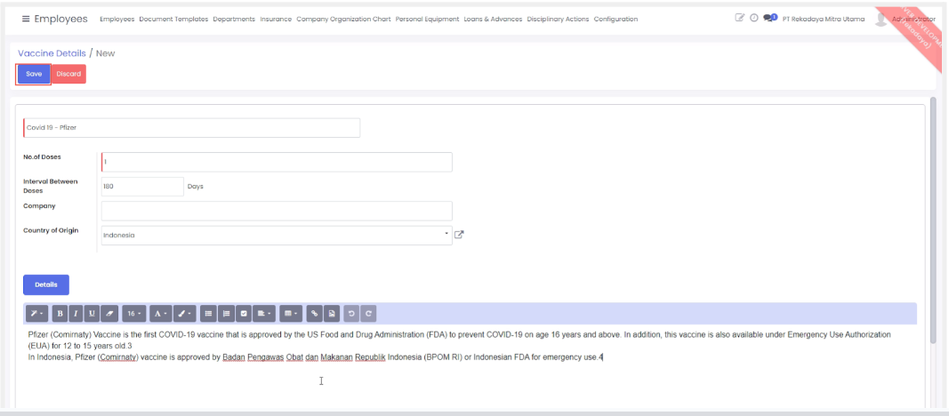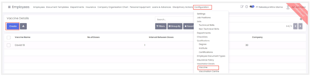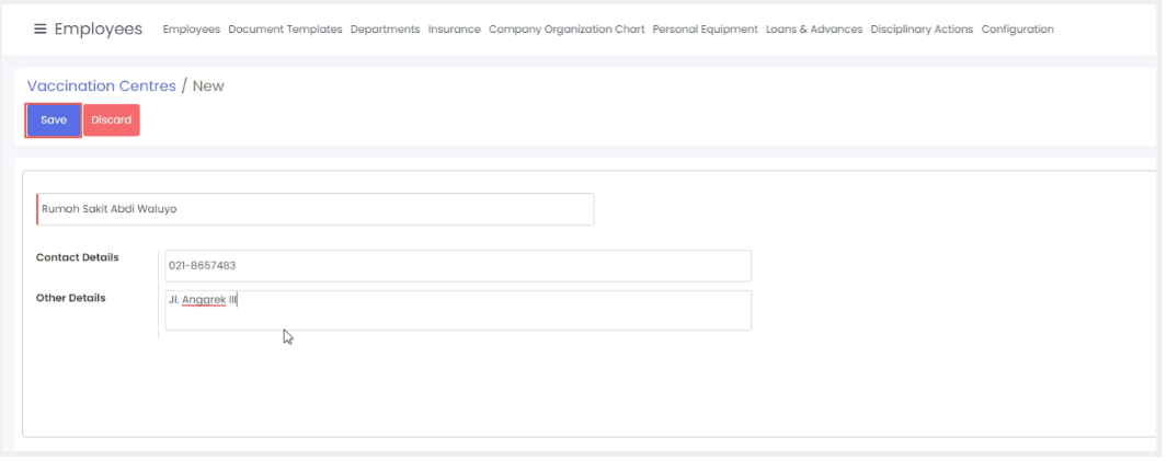 Fitur ini berfungsi untuk menyimpan data terkait vaksin yang telah dilakukan oleh karyawan dimana data akan terintegrasi dengan tab vaccination details ketika Anda membuat data karyawan baru.