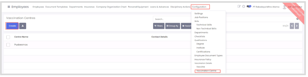 - Pilih menu configuration > vaccination centre kemudian klik create.