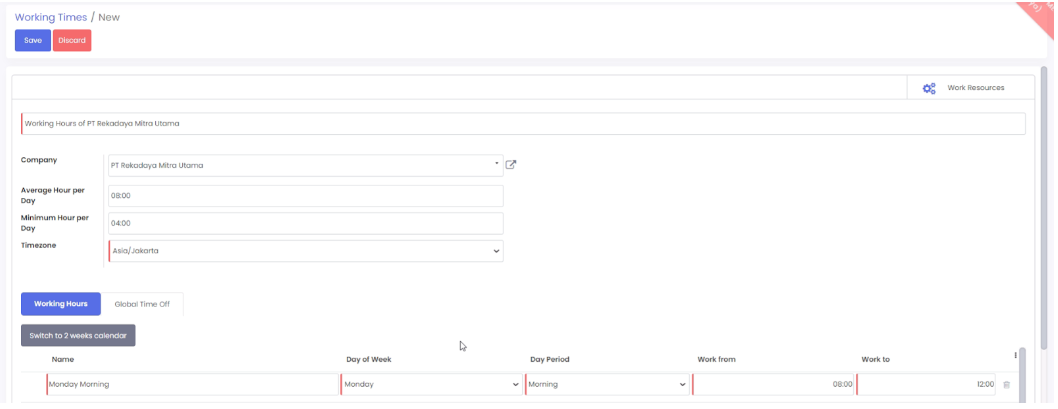 - Tab working hour, user dapat menentukan waktu kerja jika terdapat shifting untuk membagi sesi jam kerja