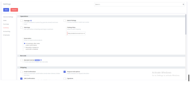 Ketika menu ini di klik akan ditampilkan fungsi - fungsi yang diinstal pada modul inventory saat ini. Ketika melakukan perubahan pada setting ini maka proses bisnis pada modul inventory juga akan berubah.
