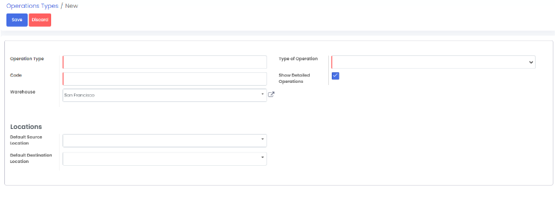 - Klik create Form untuk membuat operation types terdiri dari beberapa fields, yaitu source locations, default destination location, warehouse, dan type of operation.