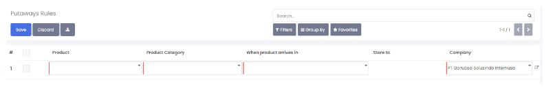 Menu ini berfungsi untuk mendefinisikan dimana suatu produk diletakan setelah diterima. Menu ini berada di configurations > putaway rules. Berikut langkah - langkah untuk menjalankan fitur terkait :