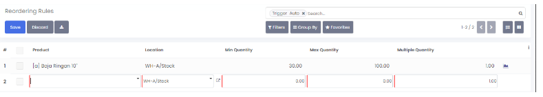 Menu ini berfungsi untuk menetapkan jumlah minimal stok untuk kepentingan pemesanan secara otomatis terjadwal. Untuk melakukan pemesanan otomatis dapat dilakukan di operation > run scheduler. Menu ini berada di configuration > reordering rules. Berikut langkah - langkah untuk create reordering rules :